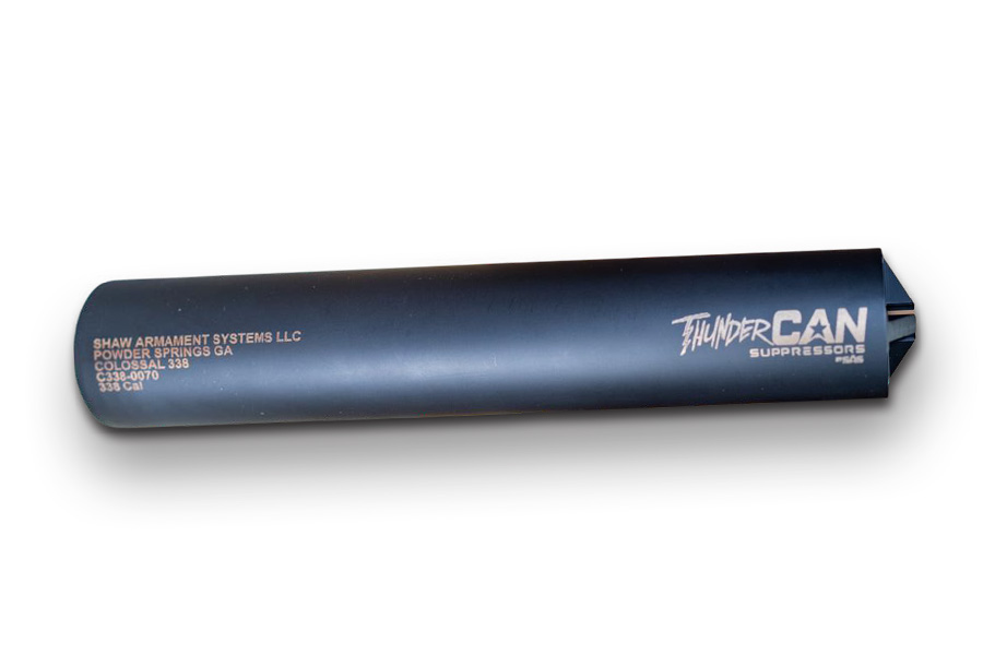 The ThunderCan Large Bore Colossal 338 Rifle Suppressor provides a perfect balance of performance, durability, and weight. The Colossal 338 Suppressor offers full titanium construction for all calibers. Our 338 large bore suppressors line provides unmatched sound suppression at nearly half of the weight of our competition.